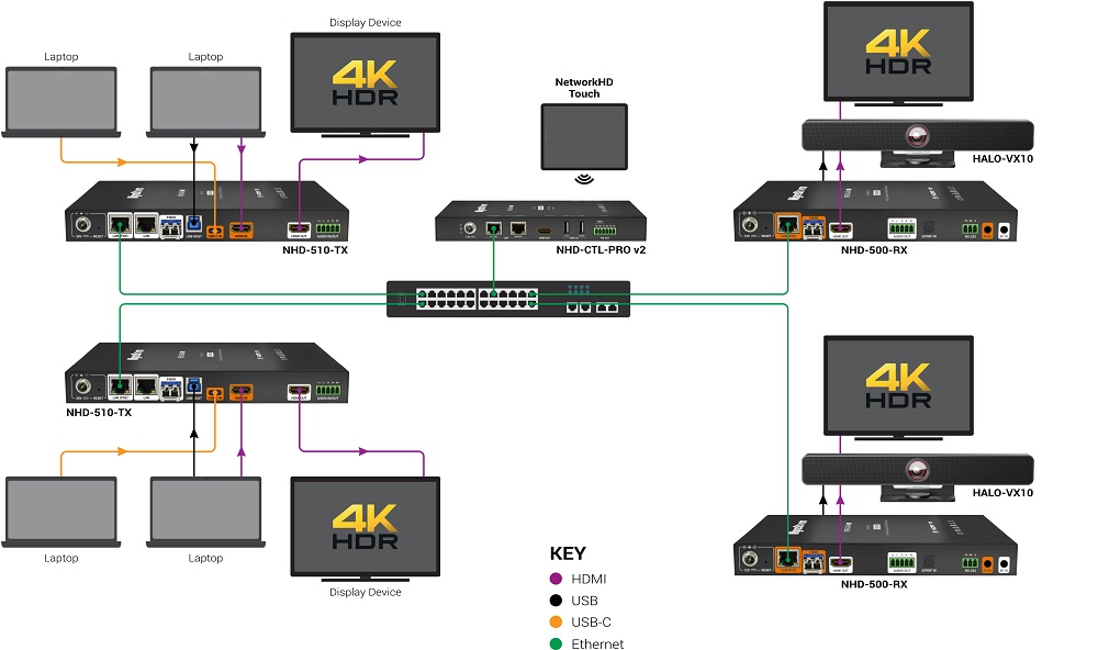 Все сигналы, включая аудио, видео, USB и сигналы управления, могут быть дискретно маршрутизированы и независимо назначены между передатчиками и приемниками.