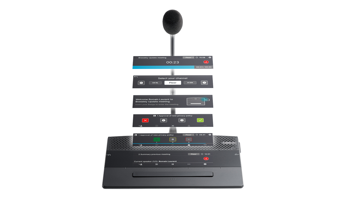- Интерактивный дисплей, показывающий информацию о собрании: тема повестки дня, кто выступает, позиция в списке запросов, таймеры выступлений, голосование и выбор языка в зависимости от активированных лицензий